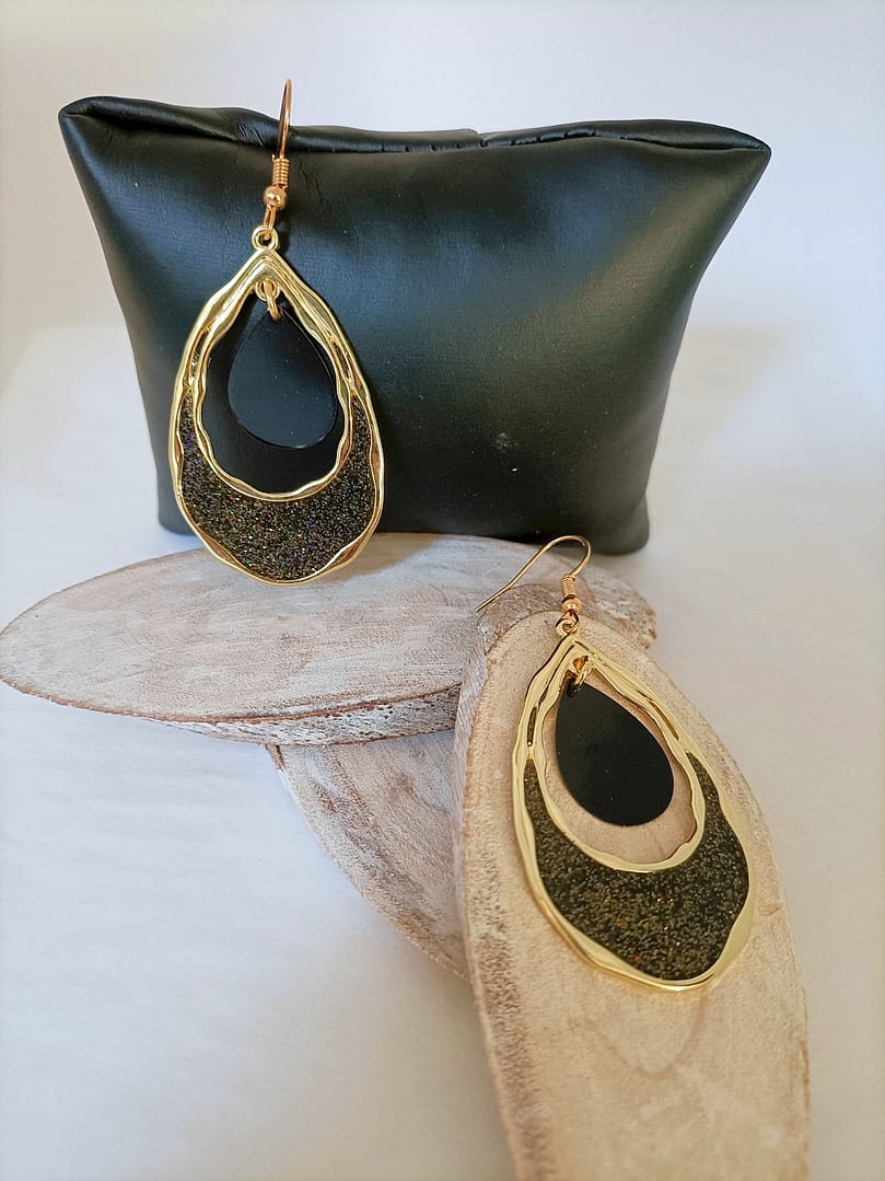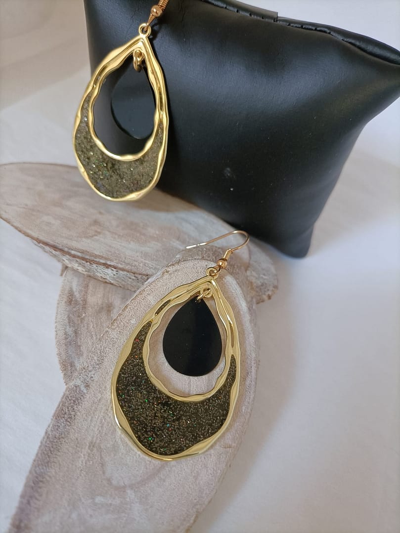 Fabriqué artisanalement en métal plaqué or, Kori est un modèle charmeur étincelant. Les gouttes sont serties d’une inclusion en résine pailletée et ponctuées d’une petite goutte en métal peint.
